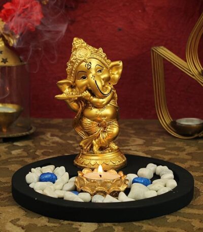 Lord Ganesha Statue with Tealight Holder Wooden Base Decorative Showpiece.