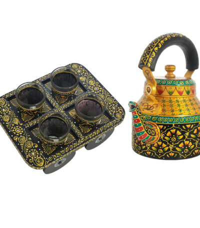 HandPainted Alluminium Tea Kettle with Four Glasses and Wooden Tray For Home Décor , Tea Party , Serving