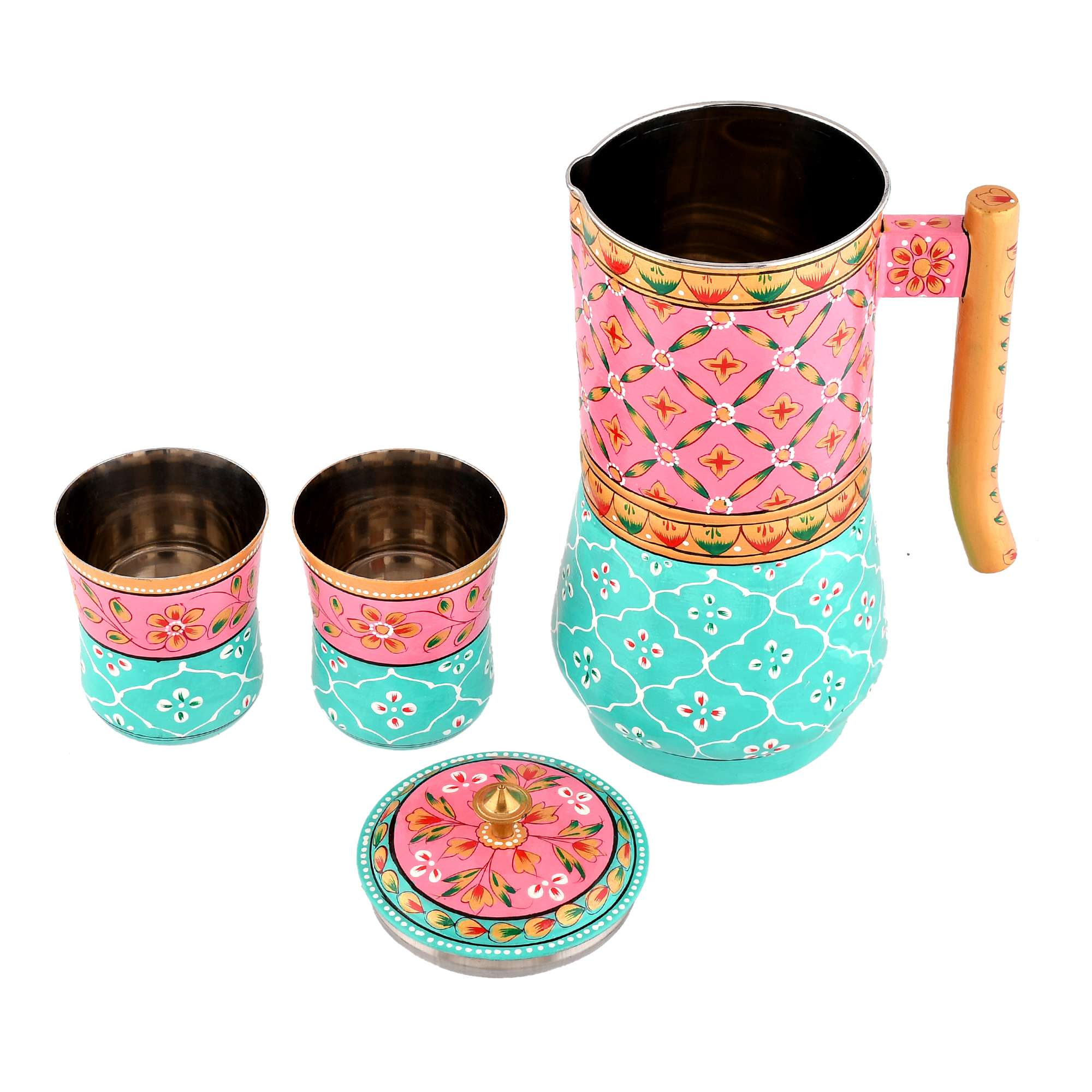 Upgrade your beverage service with this sophisticated Aluminium Jug Set, complete with two matching glass tumblers. The jug stands elegantly at 21 cm tall and is crafted from high-quality aluminium for durability and style. Perfect for serving a variety of beverages, from water to juice or cocktails, this set adds a touch of class to any occasion. The included glass tumblers complement the jug beautifully, offering a cohesive look to your table setting. Whether for everyday use or special gatherings, this Aluminium Jug Set with Glass Tumblers is a versatile and practical addition to your kitchen or dining collection. Enjoy stylish and convenient beverage service with this timeless set.